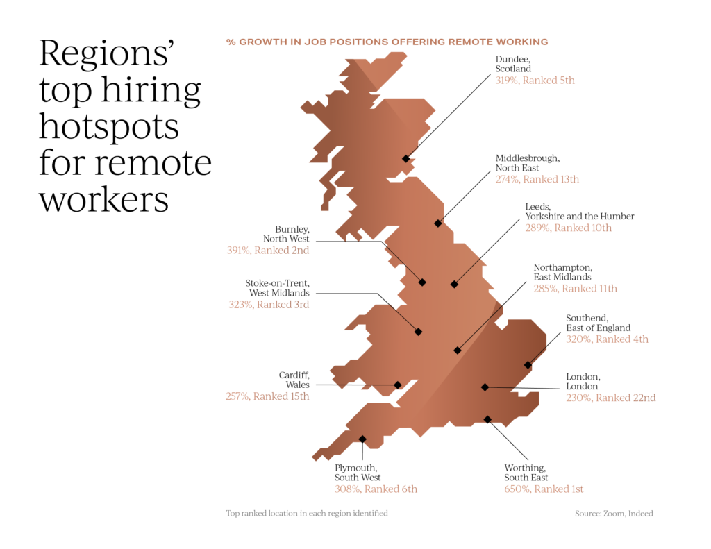 Job adverts offering the flexibility to work remotely have tripled compared to pre-pandemic levels in the top ranked so-called ‘Zoom towns’, creating new opportunities for high streets and local economies.