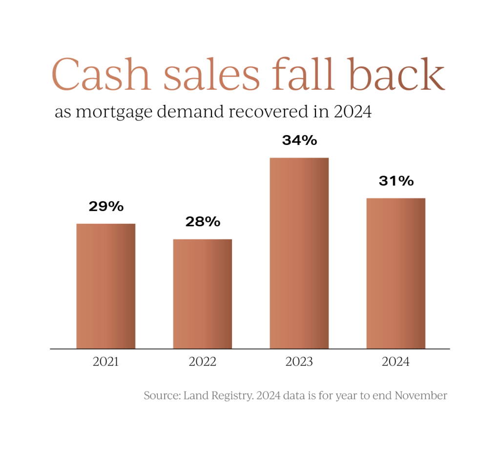 In 2023, cash buyers accounted for a notably high proportion of purchases, with 34% of transactions in England and Wales completing without a mortgage – well above the five-year average of 28%.
