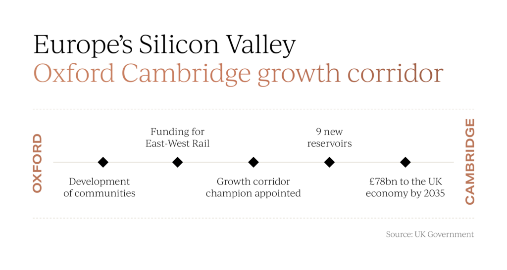 Meanwhile, the government is pushing to make the UK the home of Europe’s Silicon Valley, with the Oxford-Cambridge Growth Corridor projected to add £78 billion to the economy by 2035.