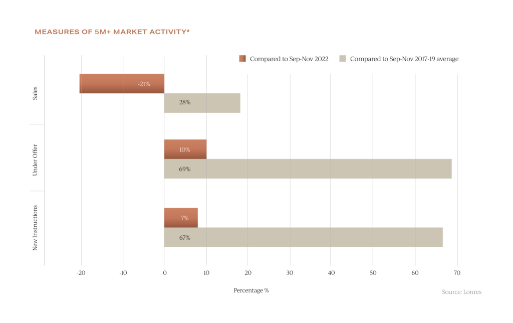 In prime central London, the best performing part of the market over the last year was the £5 million plus sector. Although only making up 8% of the total prime London market, sales increased by 28% compared with the 2017-2019 average.