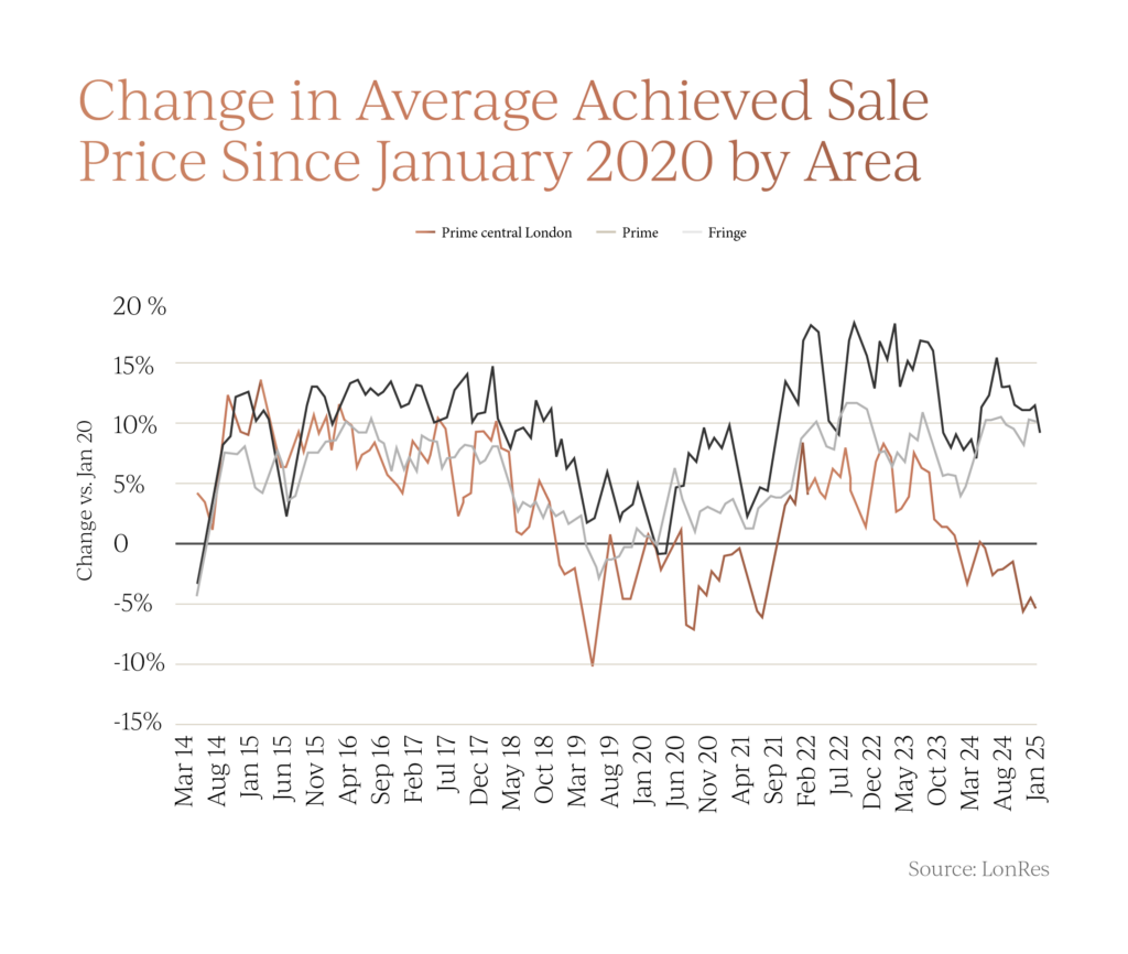 Nowhere is this shift more evident than in London. As illustrated above, price growth across the capital has been highly fragmented, with outer prime areas demonstrating resilience while traditionally expensive central locations continue to see price adjustments.