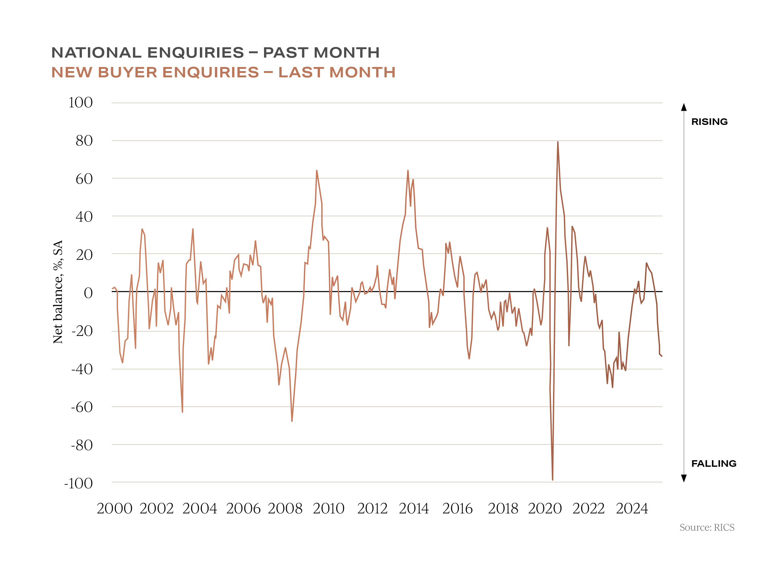 Momentum is unlikely to persist, however RICS reports a net balance of -33% for new buyer enquiries in April and -31% for sales agreed, the weakest since August 2023. That said, a net +17% of agents still expect transactions to rise over the next year.